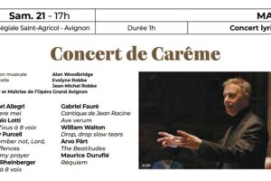 Samedi 21 mars 2026, 17h, Collégiale Saint-Agricol, Avignon Chœur de l’Opéra Grand Avignon (site officiel), direction musicale Alan Woodbridge Maîtrise de l’Opéra Grand Avignon (site officiel), direction musicale Christophe Talmont Violoncelle, Evelyne Robbe. Orgue, Jean Michel Robbe Gabriel Fauré, Messe basse pour chœur à voix égales et orgue : Kyrie eleison, Sanctus, Benedictus, Agnus ... […lire la suite]