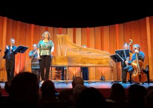 Des deux Concertos Brandebourgeois de Bach en seconde partie, c’est d’abord le n°5 en ré majeur qui impressionne, principalement un concerto soliste pour clavecin où Céline Frish se montre étincelante. Pour ce morceau, l’instrument est amené au plus près du public, couvercle soulevé pour projeter idéalement le son. Sollicitée quasiment de bout en bout, la claveciniste démontre sa virtuosité et la densité de son jeu, en particulier au cours d’une longue cadence, absolument passionnante. La musique qui accompagne est plus délicate, par un ensemble en plus petit effectif, dont cinq cordes, soit un musicien par pupitre.