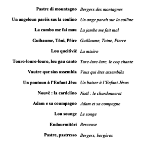 Ce programme de chants traditionnels n’a de sens pour nous aujourd’hui que s’il est prolongé par la création de nouveaux chants de Noël composés dans le même esprit que les anciens mais sur des textes inédits et des mélodies d’aujourd’hui. Cela permet de montrer que la création de noëls en langue provençale ne s’est pas éteinte et que les festivités calendales suscitent toujours le même enthousiasme dans notre région.