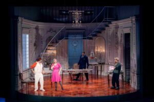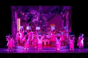 Surtout sollicités au troisième acte, les chœurs de l’Opéra de Toulon se mettent au niveau de cette belle distribution, malgré de légers et brefs décalages entre pupitres, sans doute dus à la chorégraphie qu’ils doivent assurer en même temps que le chant. Ils paraissent alors habillés en lutins rose dans une maison transformée en cette couleur, suivant la volonté de Norina. La jeune femme a fait modifier la décoration, un grand sapin trônant au centre avec un « N » au faîte, pour Norina …. mais cela fonctionne aussi pour Noël en cette période de fêtes ! Avant le second tableau du dernier acte, pour la sérénade Com’è gentil d’Ernesto, deux bonhommes de neige géants de couleur rouge, sont gonflés à vue, ménageant une courte pause dans la musique.