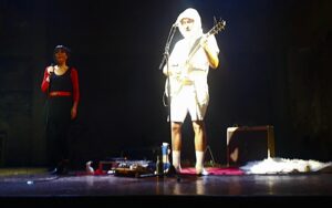 Après un intermède place des Carmes avec l’incroyable Chorale sauvage, une cinquantaine d’amateurs qui répètent dehors toute l’année et vous envoient leur chant joyeusement libertaire en plein visage, le duo Flutte a pris le relais sur scène. Un homme, plus ou moins cagoulé d’abord en animal, une femme à la belle voix de diva, et le duo passe du lyrique au rock électro, vire au burlesque, à la farce, pour se payer la tête des masculinistes et autres mâles alpha ou livrer sous la forme d’un conte de fée une fable écologique, drôle et cruelle où le patron honni finit en compost. Il se fait trio pour accueillir la toute jeune Luisa et son joli filet de voix. Là encore, pas d’effets, très peu de décor hormis deux lapins luminescents, des chansons sans filtre qui ont fait le bonheur d’une salle comble. Le samedi soir, le Festival accueillait Pascal Mary et Des sorcières comme les autres, d’après Anne Sylvestre. Et se tenait, succès oblige, à guichets fermés. Rendez-vous cet été pour fêter en plein air le retour de ces Drôles d’oiseaux.