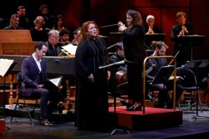 On ne dira jamais assez la richesse des orchestres baroques qui sont nés et se sont développés ces dernières décennies dans notre pays, faisant de la France une exception culturelle dans ce répertoire, depuis Les Arts Florissants, en passant par Les Musiciens du Louvre, Les Talens Lyriques, Pygmalion, etc. Ce soir, l’ensemble Il Caravaggio confirme cette excellence, orchestre fondé en 2017 qui joue sur instruments d’époque et que dirige sa fondatrice Camille Delaforge. Assurant en même temps le jeu de son clavecin, la cheffe développe une gestique ample et généreuse, qui semble faire corps avec la musique et marque les temps avec précision. Le continuo est admirable, tout comme les bois et les cordes qui font preuve de virtuosité, bref un ensemble parfaitement destiné à ce type de répertoire.