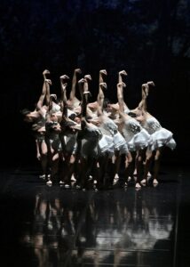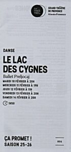 Installé depuis 2006 au Pavillon Noir, situé à deux pas du Grand Théâtre de Provence, Angelin Preljocaj est venu en voisin pour reprendre sa chorégraphie du Lac des cygnes, créée en 2020. Le chorégraphe est d’ailleurs un très fidèle des lieux, puisqu’il y a créé ou repris 12 ballets depuis 2017. Preljocaj revisite ce soir l’un des plus grands sommets de la danse classique, ceci en conservant la trame du ballet original de Marius Petipa et Lev Ivanov, mais tout en actualisant le propos, par les moyens de la chorégraphie, de la musique, ainsi que de la vidéo, très présente et réussie. Cette version est elle-même devenue un classique, puisque deux autres chroniqueurs de Classiqueenprovence l’avaient vue, dans des configurations bien différentes, en projection différée au cinéma Rivoli de Carpentras en janvier 2022, puis aux Chorégies d’Orange en juillet 2025.