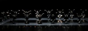 Nous assistons d’abord à une forme de réception dans un vaste hall, avec seaux à champagne posés sur deux tables et une grande maquette d’un complexe industriel qu’on pousse sur roulettes, tandis que pour l’extérieur, les vidéos projetées en fond de plateau montrent la pluie sur les buildings, façon Manhattan. Entre les extraits de la classique partition de Tchaïkovski sont intercalés certains passages musicaux plus actuels, signés 79D. Les contrastes de son et d’image produisent un bel effet, quand par exemple les mouvements ralentissent pour Tchaïkovski, à la fois ceux des danseurs et des images projetées, puis repartent sur une musique bien plus moderne, légèrement jazzy. Egalement lorsque l’ensemble des danseurs défile sur des lignes orthogonales, pour finir en deux lignes face au public, ou bien encore la musique techno qui illustre efficacement la boîte de nuit.