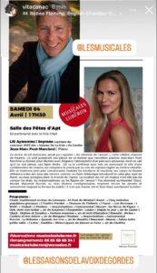 Le duo offrira une palette d’airs d’opéra et un florilège de mélodies (réservation ici) ; le même concert, participatif, aura été donné la veille à 14h aux enfants des écoles d’Apt.