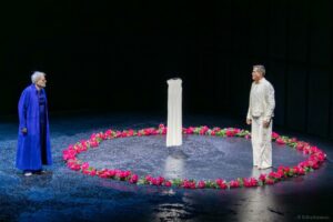 En ce soir de première, la salle de l’Opéra Grand Avignon, pleine jusqu’au troisième balcon, reste éclairée. La scène aussi est baignée d’une douce lumière blanche.