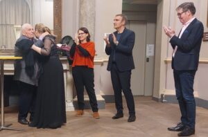 Lors de la rencontre post-concert, en présence des tutelles, de personnalités et d’amis, il a rappelé qu’il fréquente cette maison d’opéra (tout juste bicentenaire, et qui fut d’abord Théâtre municipal d’Avignon, puis Opéra-théâtre d’Avignon, avant de devenir par changement de statut Opéra Grand Avignon)… depuis 80 ans, alors que son père était maire de la ville, et que lui-même, enfant, connaissait autant les coulisses que les spectacles. (Photo, de g. à dr. Frédéric Roels – directeur de l’Opéra Grand Avignon -, Claude Morel – vice-président du Grand Avignon -, Robert Dewulf – président de MBA -, Michel Bissière – conseiller régional -, Raymond Duffaut, Delphine Haidan – mezzo-soprano -, Jérôme Corréas – claveciniste -, Karine Deshayes – soprano -, Jean-Michel Dhuez – producteur Radio-Classique -).