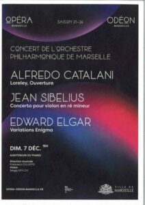 Alfredo Catalani : Loreley, Ouverture. Jean Sibelius : Concerto pour violon en ré mineur, op. 47. Edward Elgar : Variations Enigma, op. 36