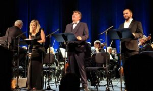 Les trois solistes sont alignés ce soir en bord de scène, derrière leur pupitre, bien utile non seulement pour le chant, mais aussi pour des dialogues parfois assez conséquents qu’il serait sans doute déraisonnable de maîtriser par cœur pour cette représentation unique. C’est le Rabastens de Philippe-Nicolas Martin qui entame les débats, belle voix lyrique de baryton, excellement projetée et à l’articulation soignée du texte. Les deux autres interprètes sont davantage des voix d’opérette, d’abord la soprano Julia Knecht en Catherine, d’une diction très claire pour les dialogues, mais parfois moins facilement compréhensible, en particulier dans le bas du registre qui se révèle moins sonore. Le ténor Xavier Mauconduit compose un Gustave attachant, qui porte souvent toute la naïveté du personnage, d’un instrument plutôt large et confortable dans le médium, mais qui a tendance à se resserrer sur des notes aiguës régulièrement émises avec un effort visible et sans doute préjudiciable à la bonne gestion des ressources vocales.