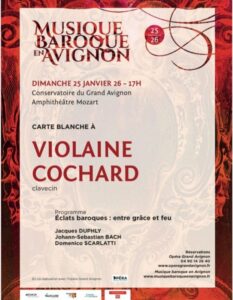 C’est une « carte blanche » qui a été proposée à l’artiste par la nouvelle équipe artistique de Musique Baroque en Avignon. Violaine Cochard est bien connue dans le Vaucluse, en solo, au sein de l’ensemble Amarillis – avec Héloïse Gaillard, flûtiste et hautboïste, et Ophélie Gaillard, violoncelliste – , ou en formation diverse avec des voix ou des ensembles de renom. Curieuse de répertoire méconnu autant que de grandes pages, elle a enregistré notamment trois compositeurs dont elle nous offrira un beau florilège, venu de Paris, Leipzig et Madrid : Jacques Duphly (1715-1789), Jean-Sébastien Bach et Domenico Scarlatti exactement contemporains (1685-1750). On appréciera la sensibilité et la virtuosité de son clavecin, « miroir des âmes baroques », qu’elle fait sonner « avec retenue ou avec feu », mais avec un égal talent. Son toucher délicat, son exquise sensibilité, en font une claveciniste très sollicitée. En cette année, on l’entendra aussi – entre autres -, dans la région Sud-Paca, le 5 août dans un programme « Scarlatti per tre » au Riches heures de Simiane-la-Rotonde (04).